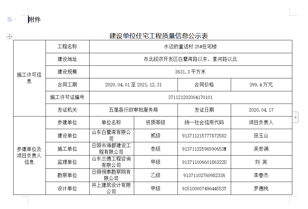 【水边的童话村】25号楼住宅工程质量信息公示